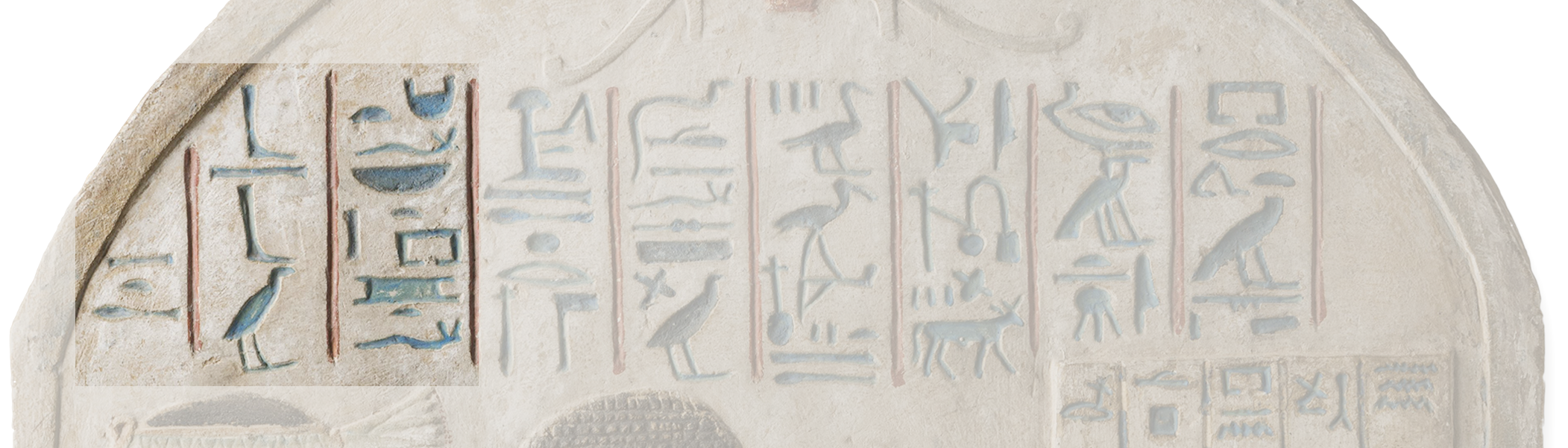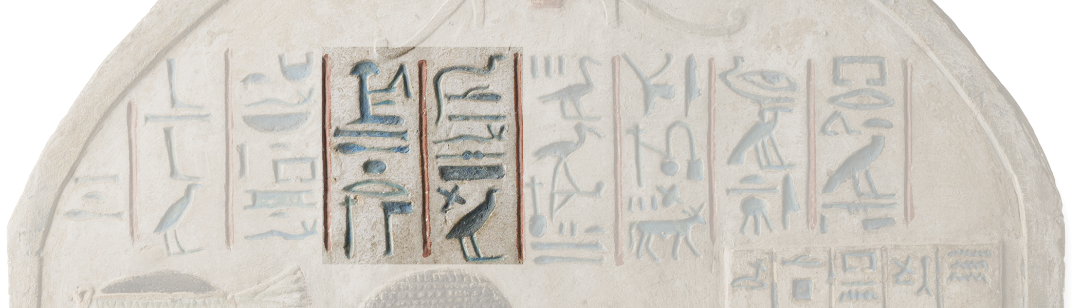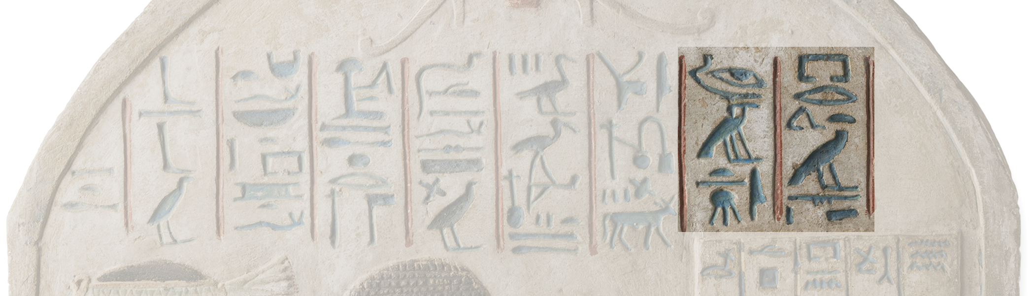 smA xt, meaning “partaking of the offerings”. Hieroglyphic inscriptions are composed in traditional Egyptian. They are rendered in sunken relief and painted in blue against a white background.