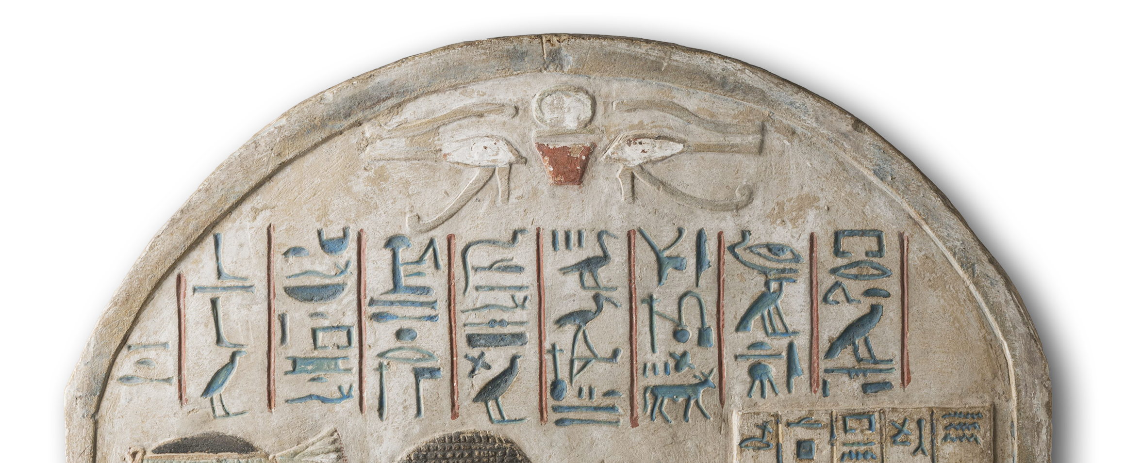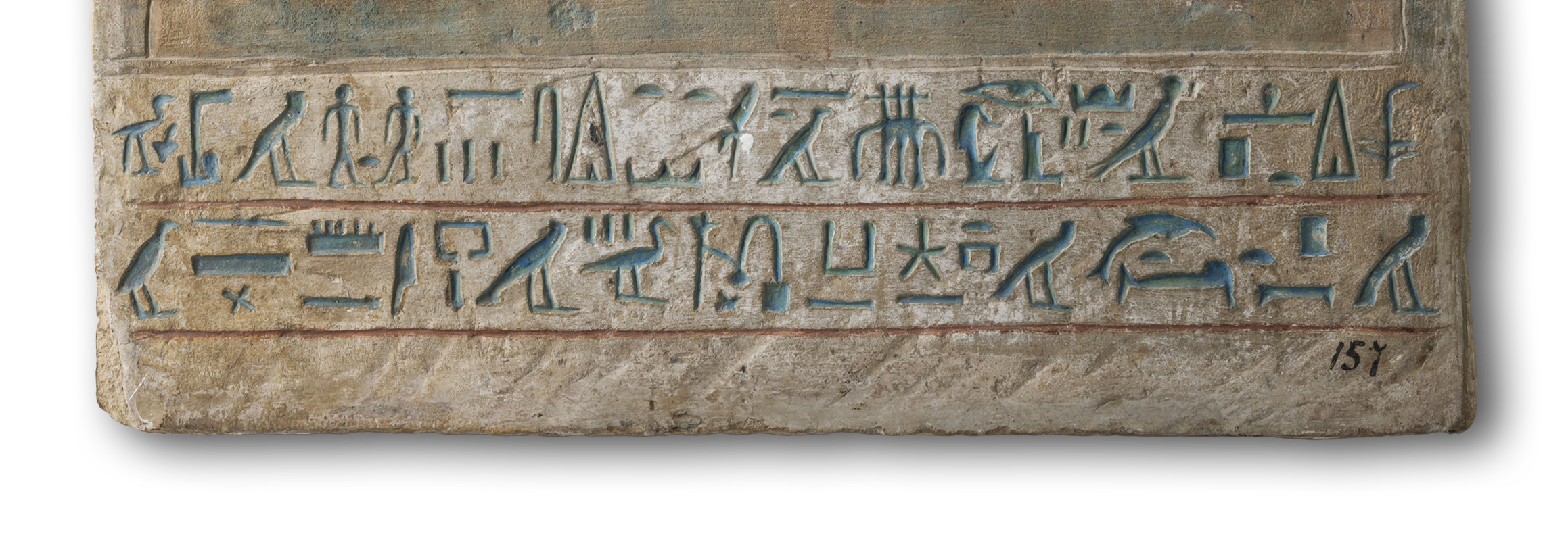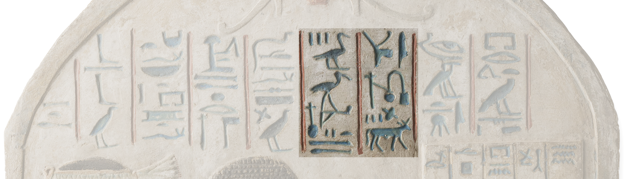 smA xt, meaning “partaking of the offerings”. Hieroglyphic inscriptions are composed in traditional Egyptian. They are rendered in sunken relief and painted in blue against a white background.