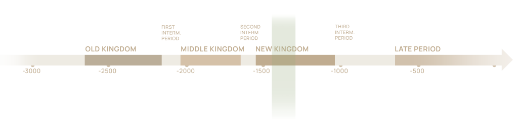 This beautifully preserved round-topped stela dates back to the New Kingdom’s 18th Dynasty (c. 1550 to 1300 BCE) before the reign of Amenhotep IV (Akhenaten). It depicts a seated couple receiving offerings, with their daughter at their feet. The man wears a white kilt and holds a staff of authority, which are important symbols of his high status. Both adults wear wigs and jewelry typical of elite fashion at the time. To the right of them is an offering table and a detailed list of offerings.